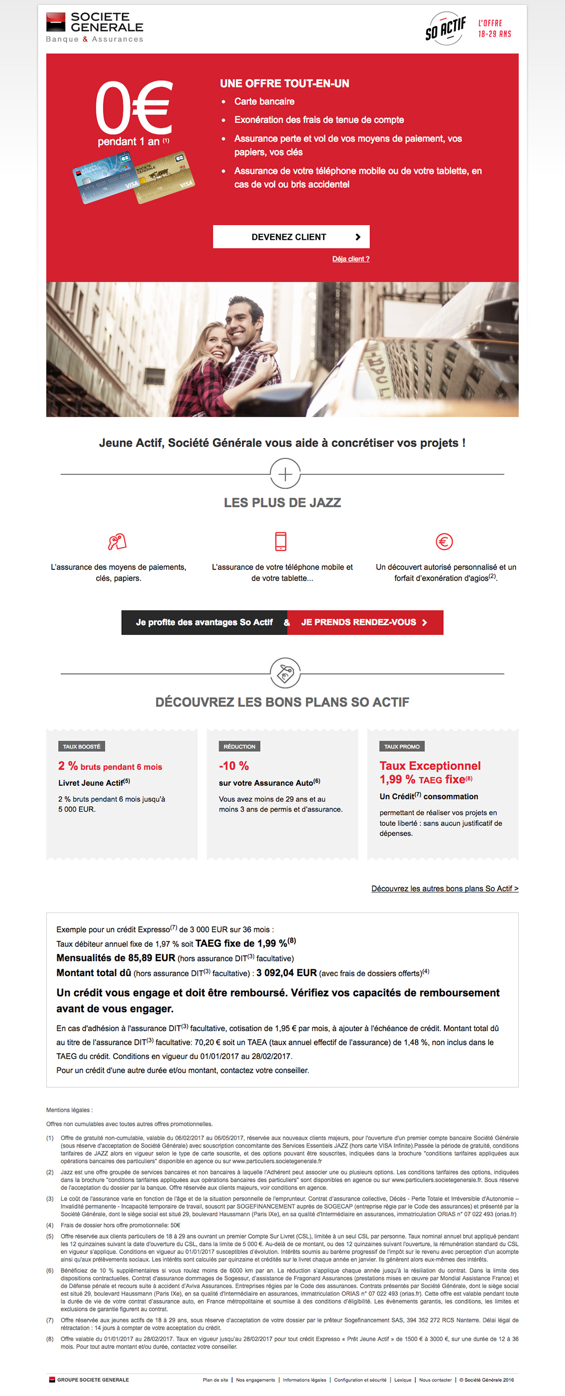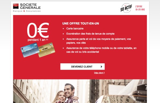 La banque Société Générale crée une nouvelle offre pour l'ouverture de comptes bancaire et lance une campagne menant sur une landing page promotionnelle.